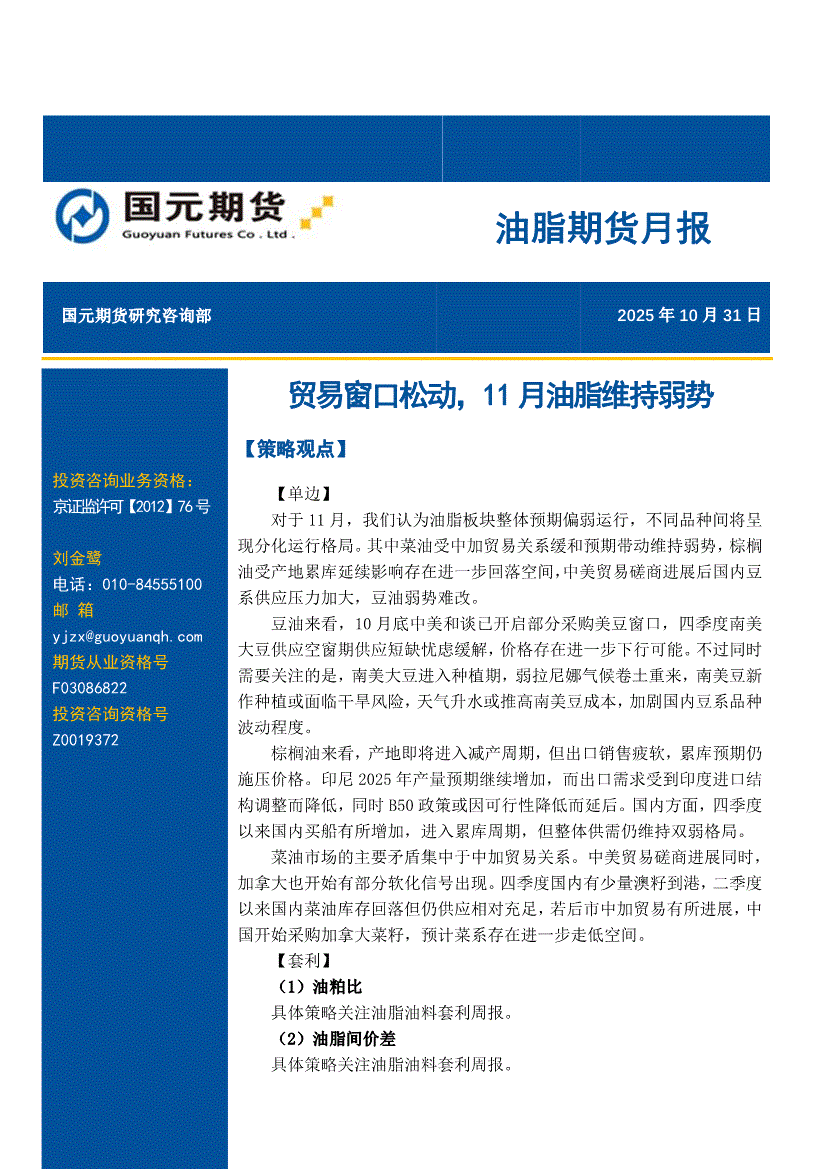 国元期货-油脂期货月报:贸易窗口松动,11月油脂维持弱势-251031