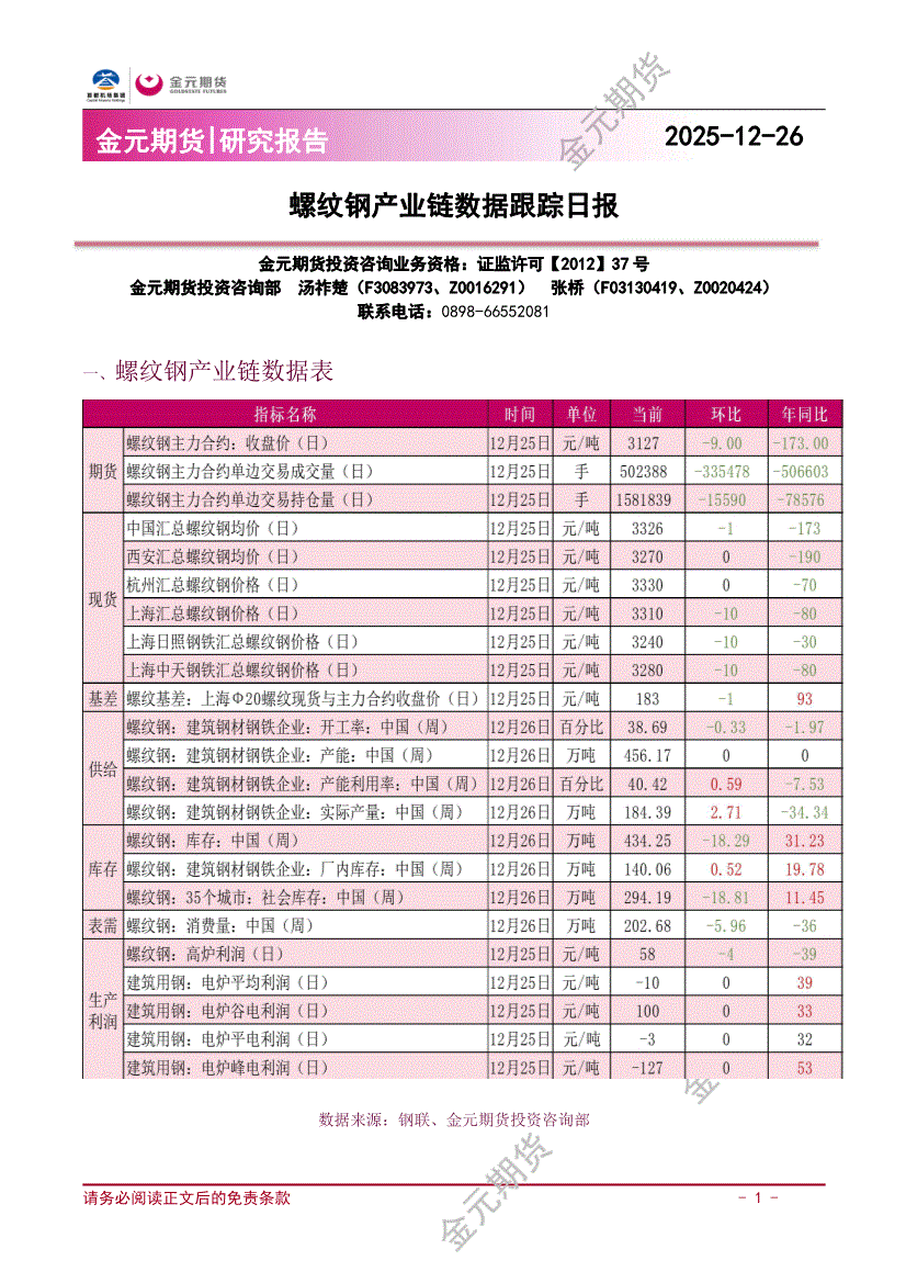 金元期货-螺纹钢产业链数据跟踪日报-251226