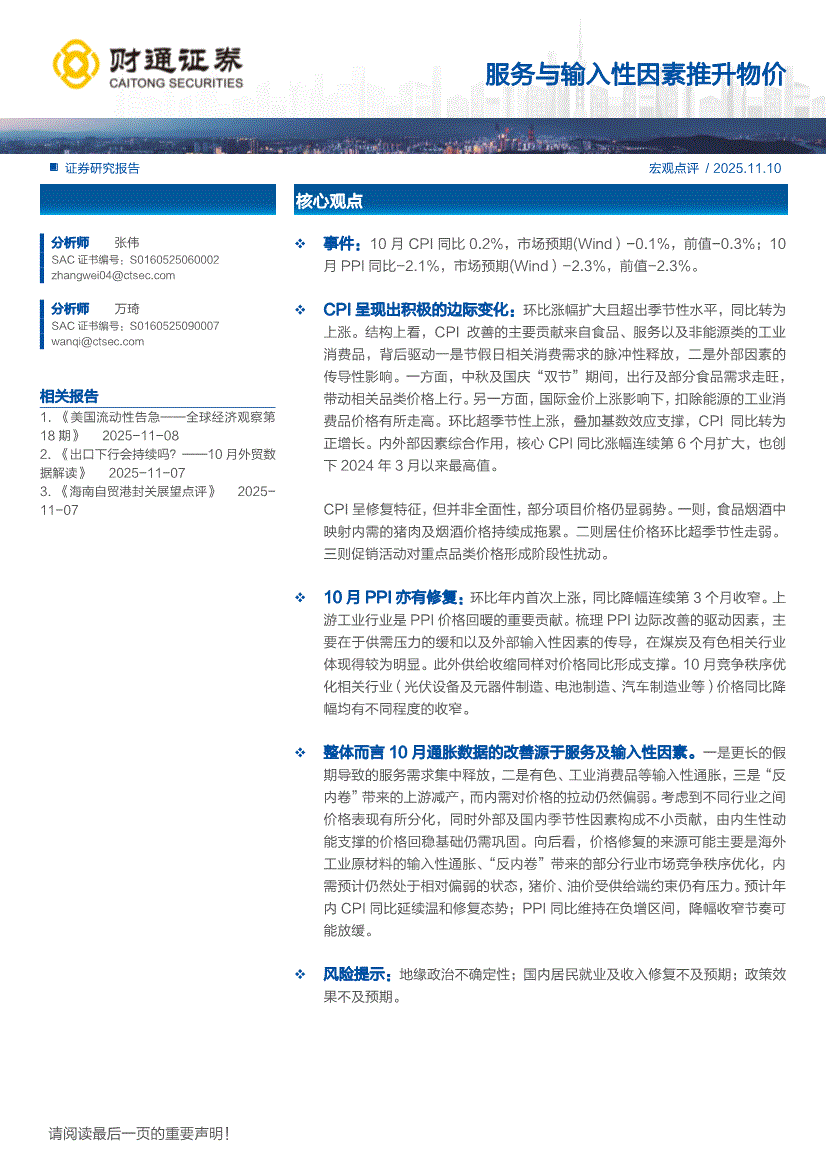 财通证券-服务与输入性因素推升物价-251110