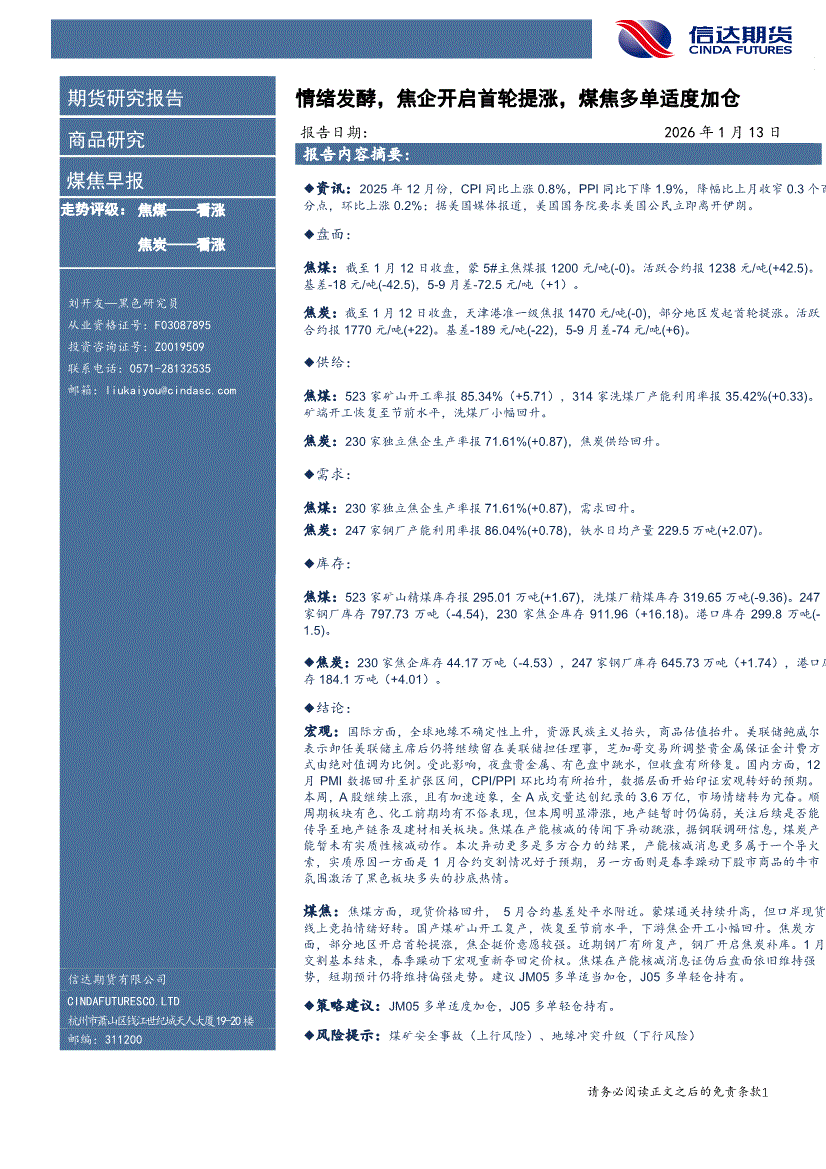 信达期货-煤焦早报:情绪发酵,焦企开启首轮提涨,煤焦多单适度加仓-260113
