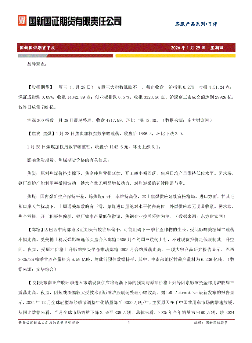 国泰君安期货-股指期货将震荡整理,黄金期货价格再创历史新高,黄金、白银期货将震荡偏强-260129