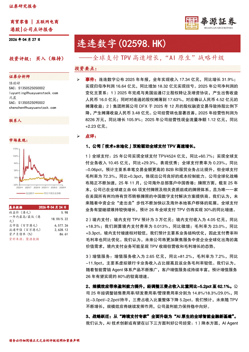连连数字:华源证券-连连数字-2598.HK-全球支付TPV高速增长,“AI原生”战略升级-260427