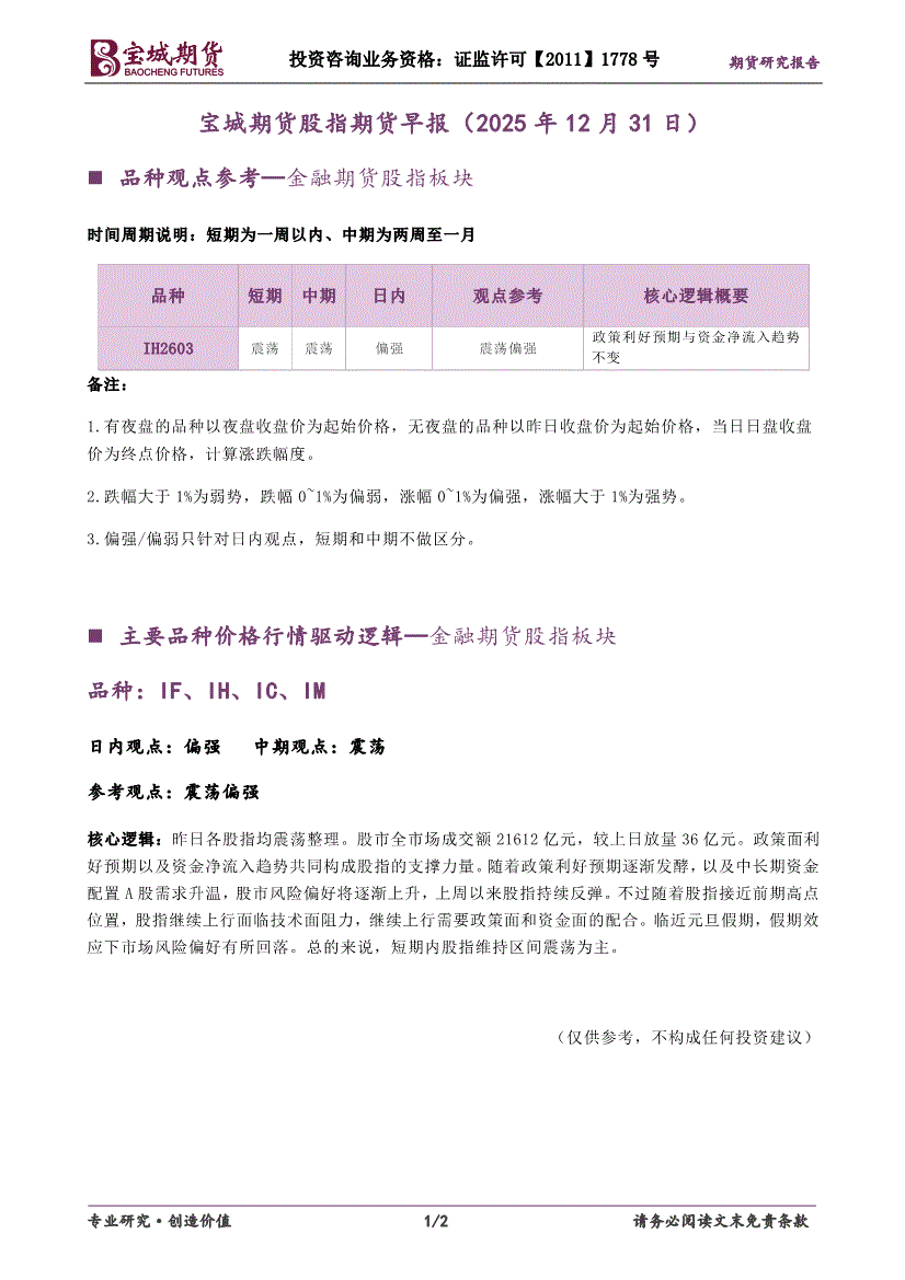 宝城期货-股指衍生品周报:短期内股指震荡偏强-251229