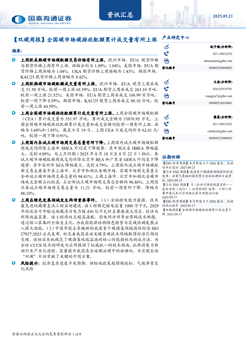 国泰海通证券-资讯汇总:【双碳周报】全国碳市场碳排放配额累计成交量有所上涨-250923