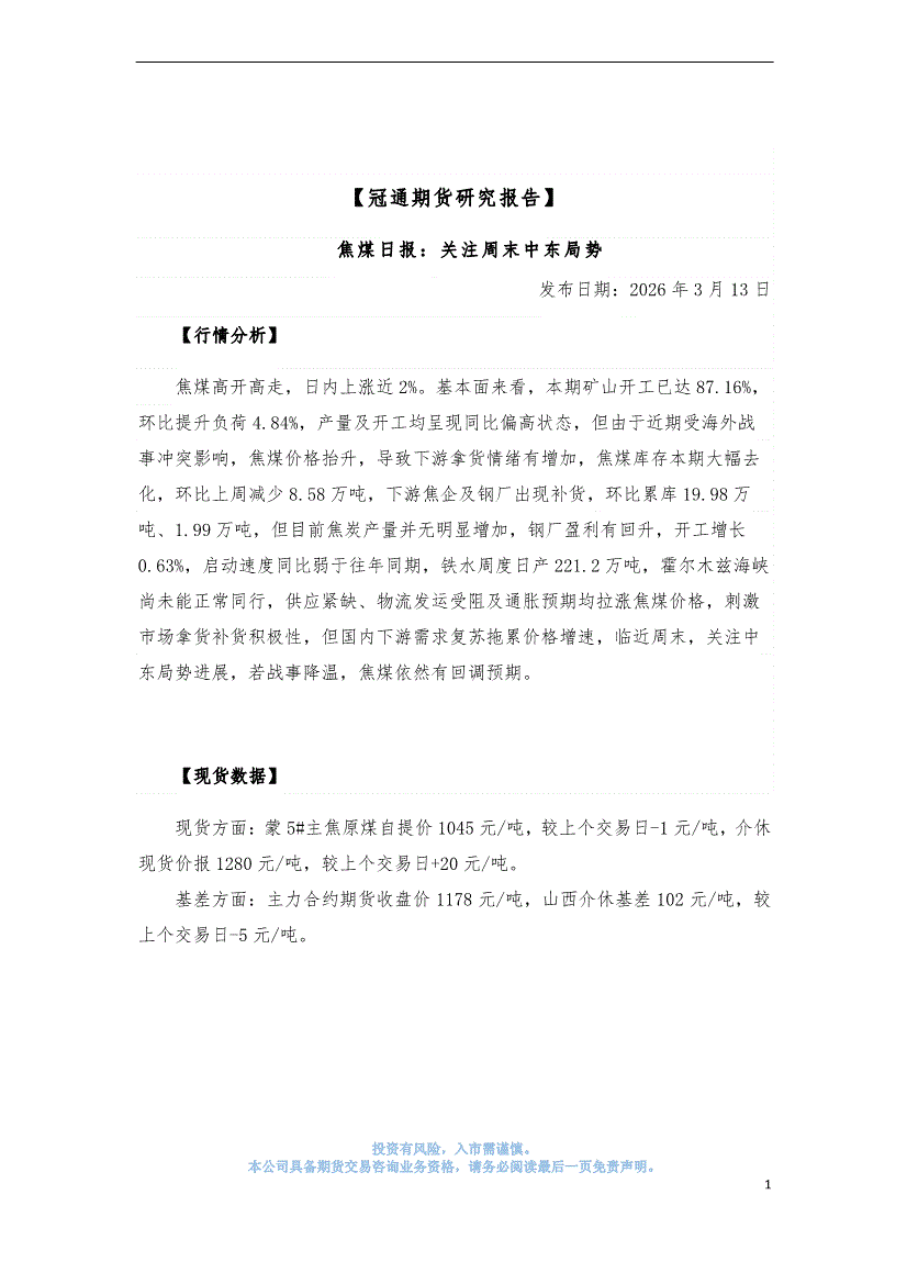 冠通期货-焦煤日报:关注周末中东局势-260313