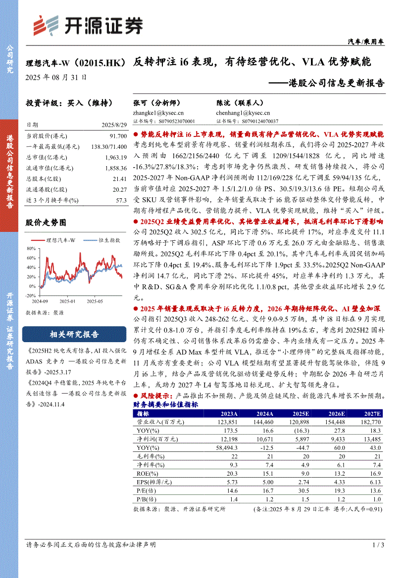 理想汽车~W:开源证券-理想汽车~W-2015.HK-港股公司信息更新报告:反转押注i6表现,有待经营优化、VLA优势赋能-250831