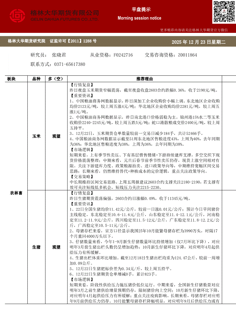 格林大华期货-早盘提示:玉米生猪鸡蛋-251223