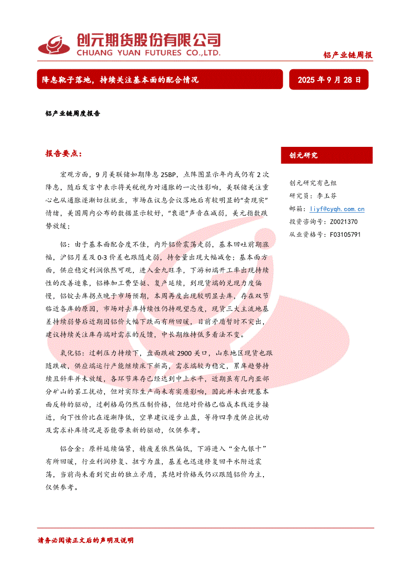 创元期货-铝产业链周度报告:降息靴子落地,持续关注基本面的配合情况-250928