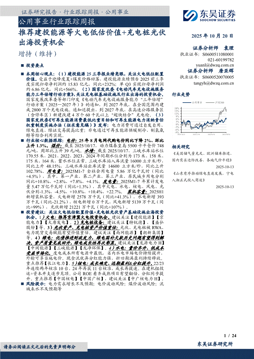 公用事业行业:东吴证券-公用事业行业跟踪周报:推荐建投能源等火电低估价值+充电桩光伏出海投资机会-251020