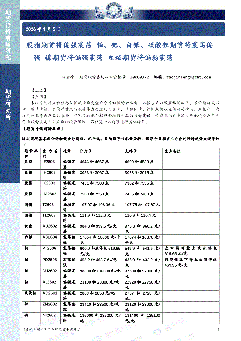 国泰君安期货-股指期货将偏强震荡,铂、钯、白银、碳酸锂期货将震荡偏强,镍期货将偏强震荡,豆粕期货将偏弱震荡-260105