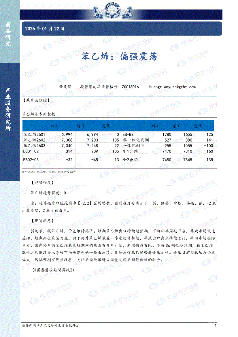 国泰君安期货-苯乙烯:偏强震荡-260122