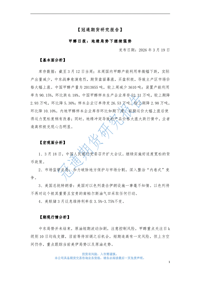 冠通期货-甲醇日报:地缘局势下继续强势-260318