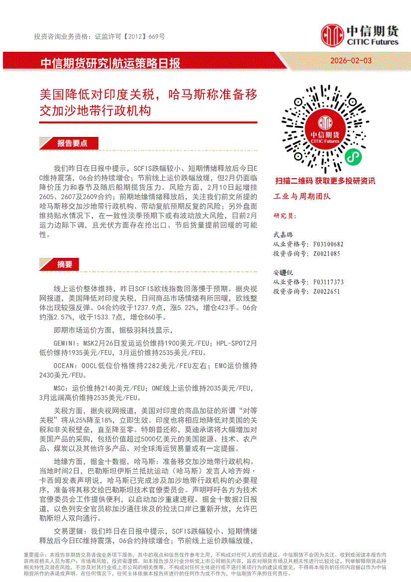 中信期货-航运策略日报:美国降低对印度关税,哈马斯称准备移交加沙地带行政机构-260203