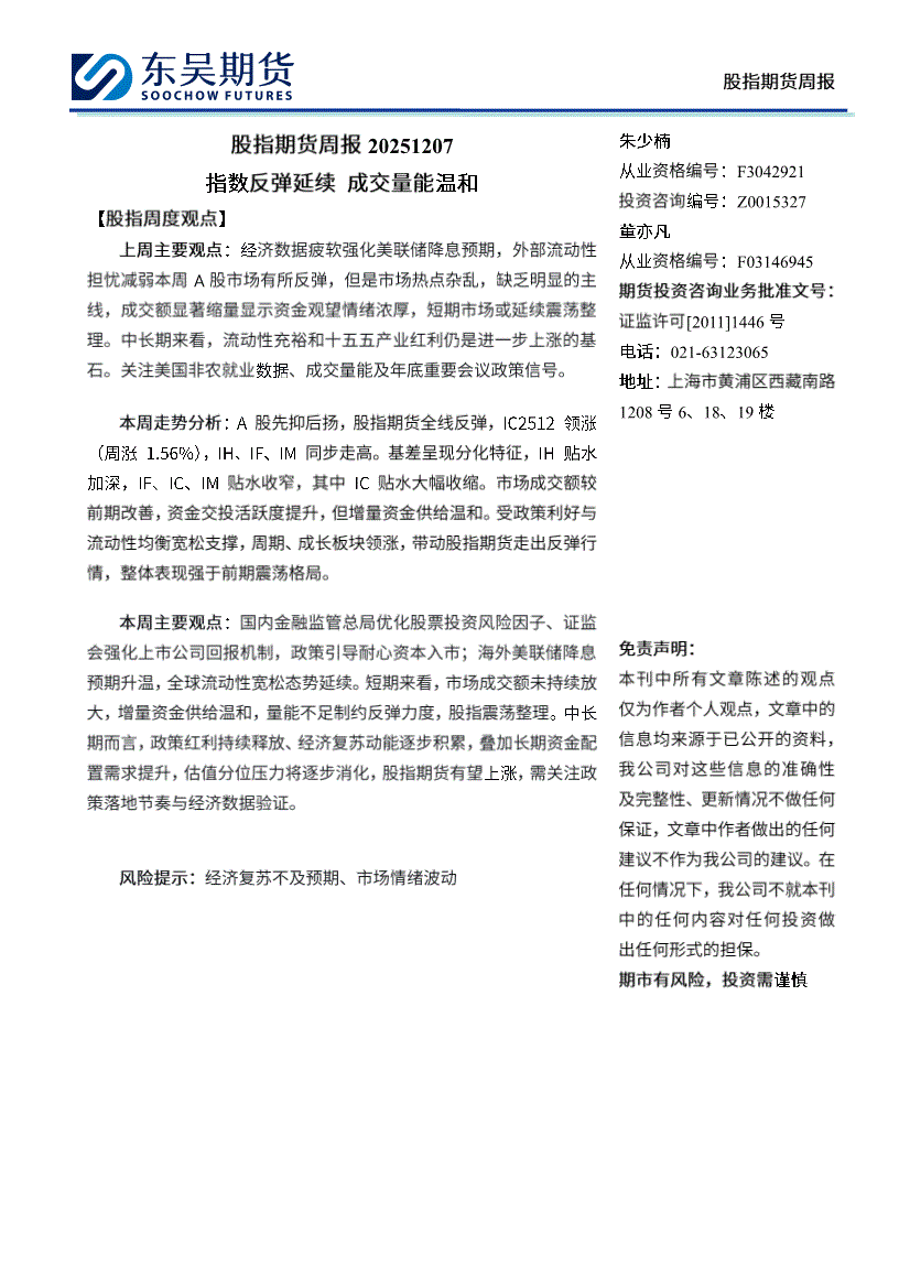 东吴期货-股指期货周报:指数反弹延续。成交量能温和-251207