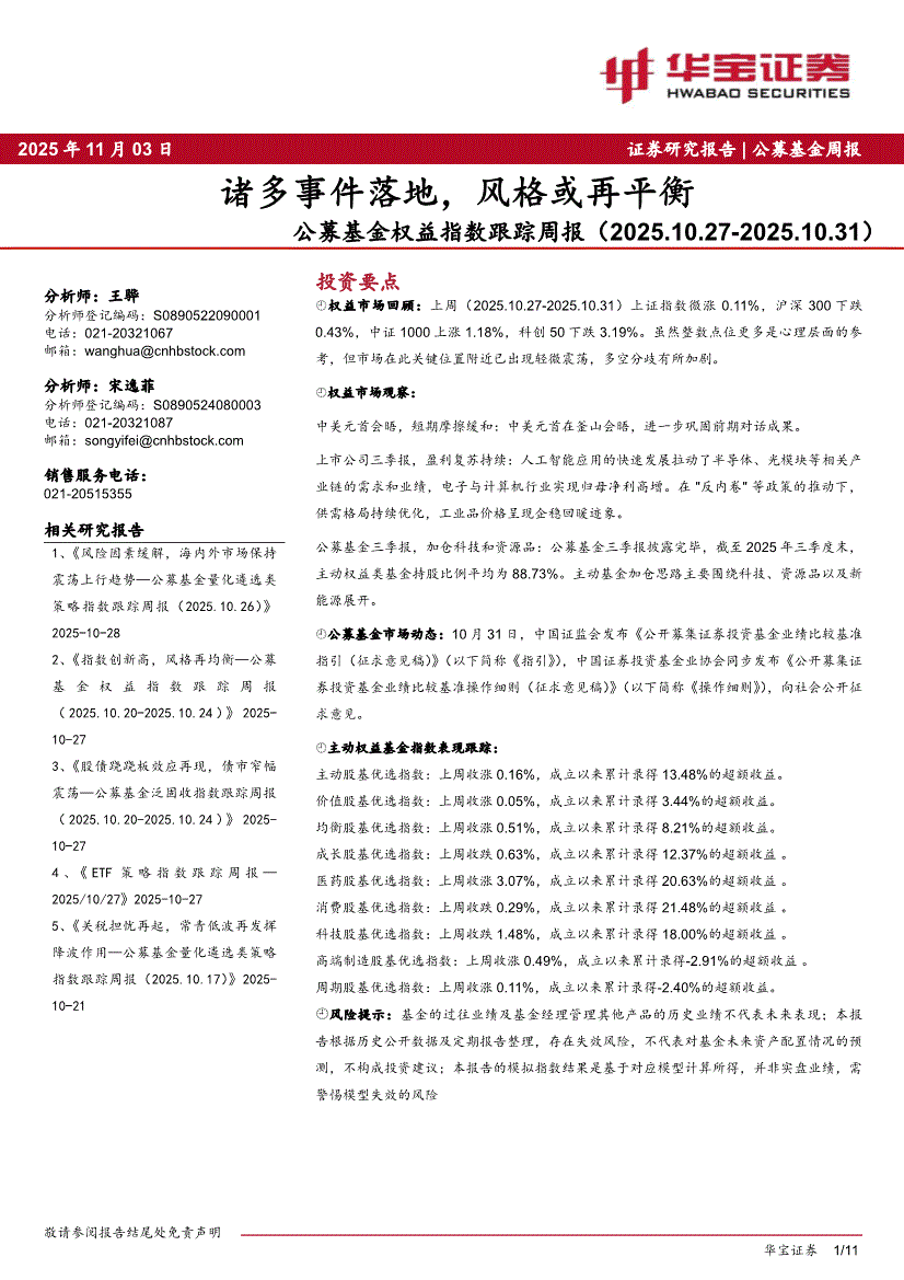 华宝证券-公募基金权益指数跟踪周报:诸多事件落地,风格或再平衡-251103