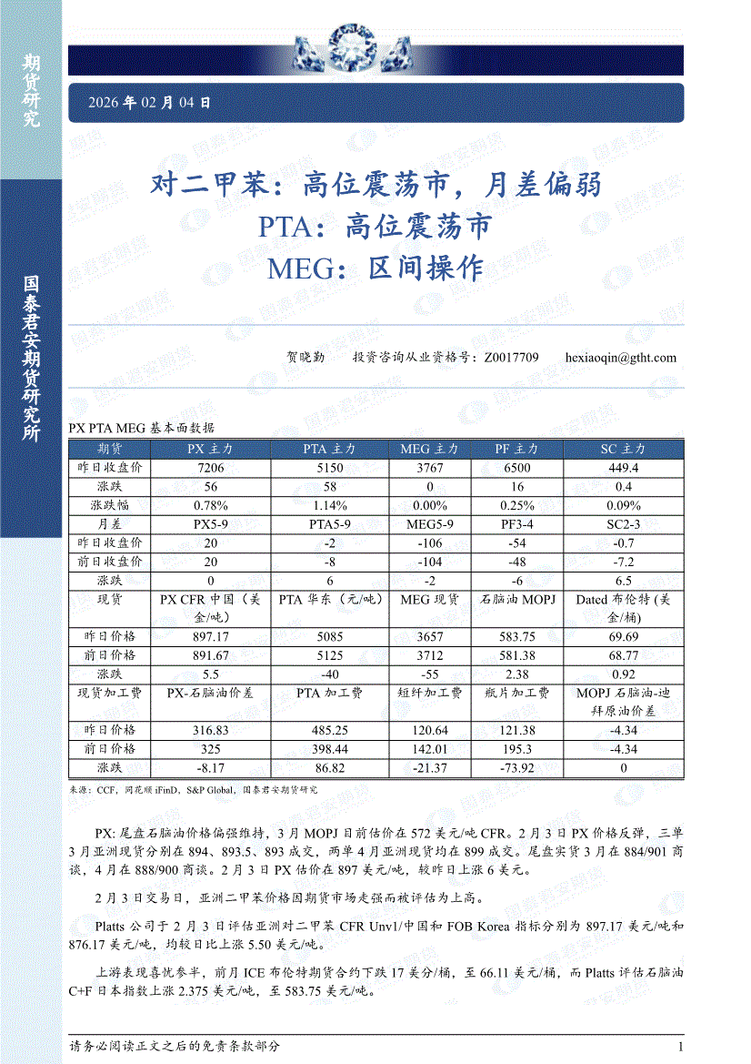 国泰君安期货-对二甲苯:高位震荡市,月差偏弱,PTA,高位震荡市,MEG,区间操作-260204