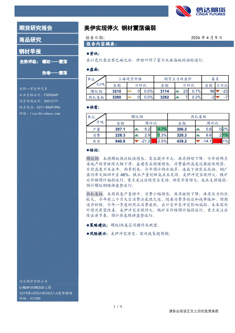 信达期货-钢材早报:美伊实现停火,钢材震荡偏弱-260409