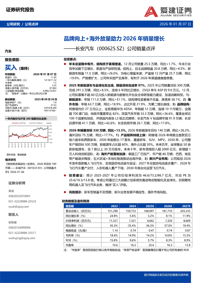 长安汽车:爱建证券-长安汽车-000625-公司销量点评:品牌向上+海外放量助力2026年销量增长-260107