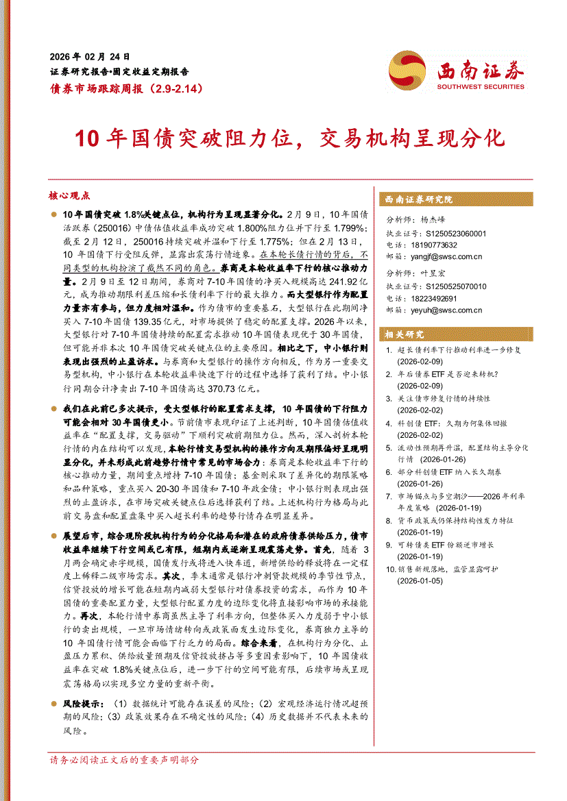 西南证券-债券市场跟踪周报:10年国债突破阻力位,交易机构呈现分化-260224