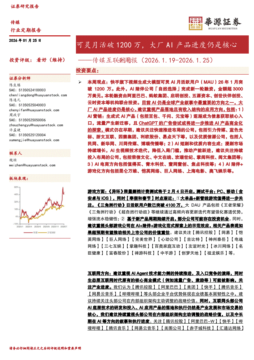 传媒互联业网行业:华源证券-传媒互联业网行业周报:可灵月活破1200万,大厂AI产品进度仍是核心-260125