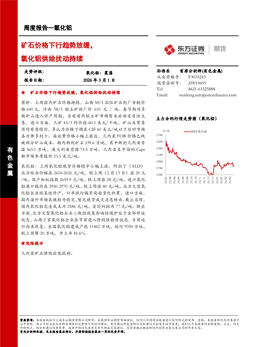 东证期货-氧化铝周度报告:矿石价格下行趋势放缓,氧化铝供给扰动持续-260301