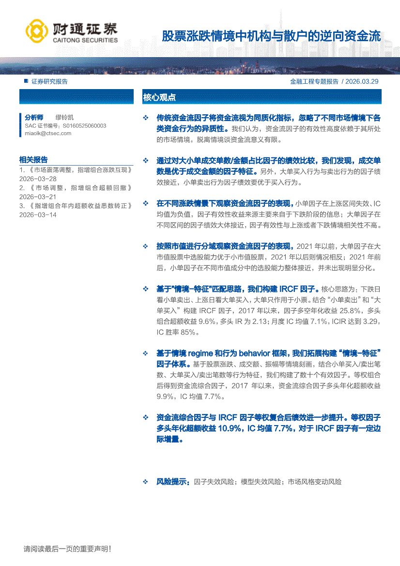 财通证券-股票涨跌情境中机构与散户的逆向资金流-260329