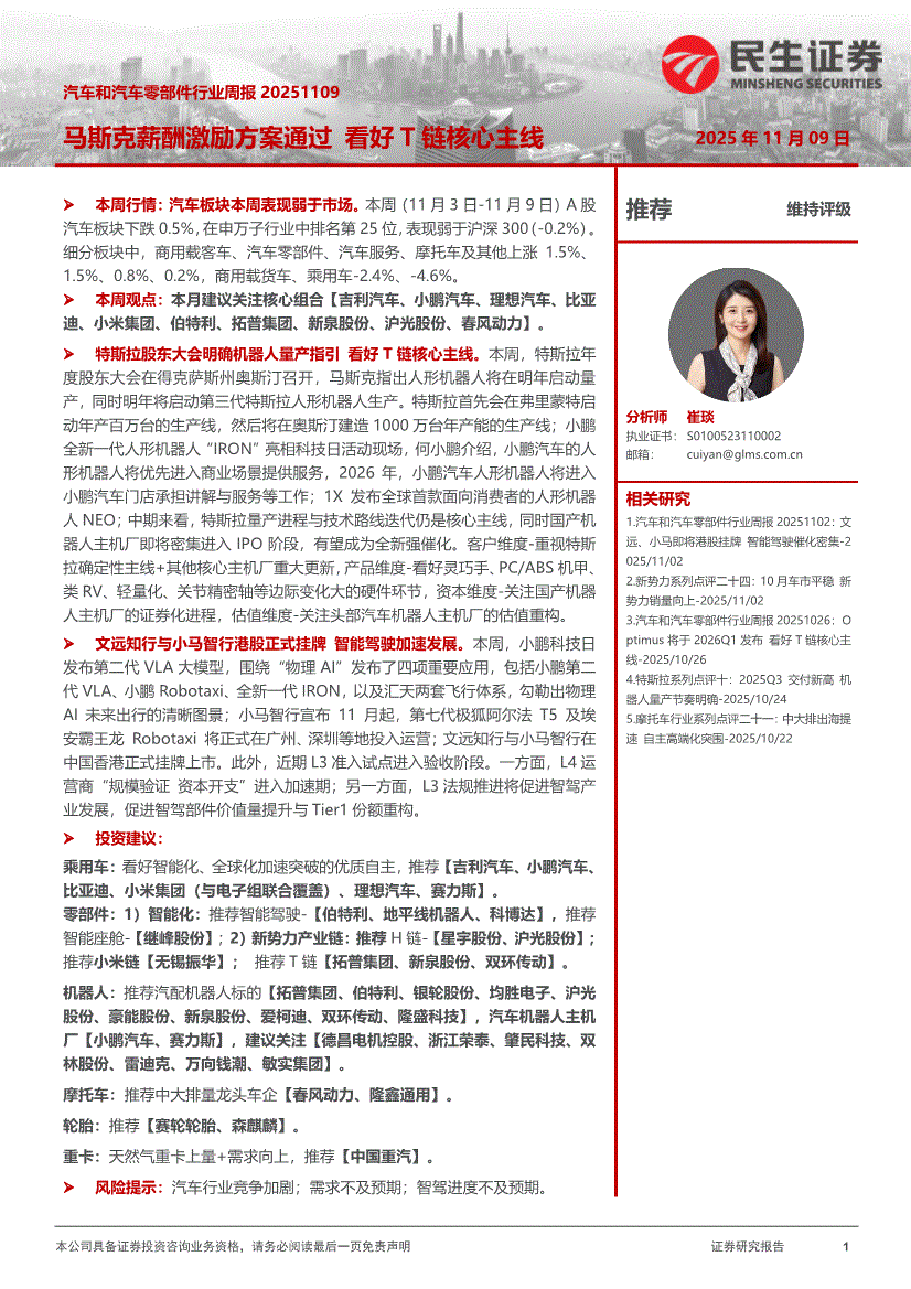 汽车和汽车零部件行业:民生证券-汽车和汽车零部件行业周报:马斯克薪酬激励方案通过,看好T链核心主线-251109