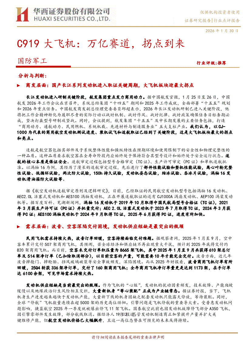 国防军工行业:华西证券-国防军工行业:C919大飞机,万亿赛道,拐点到来-260130