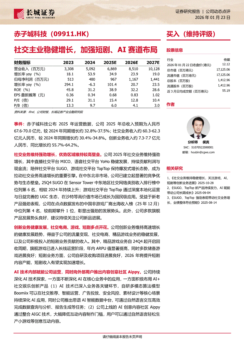 赤子城科技:长城证券-赤子城科技-9911.HK-社交主业稳健增长,加强短剧、AI赛道布局-260123