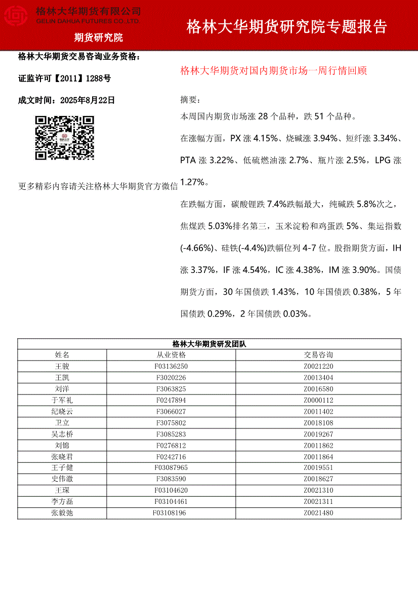 格林大华期货-对国内期货市场一周行情回顾-250822