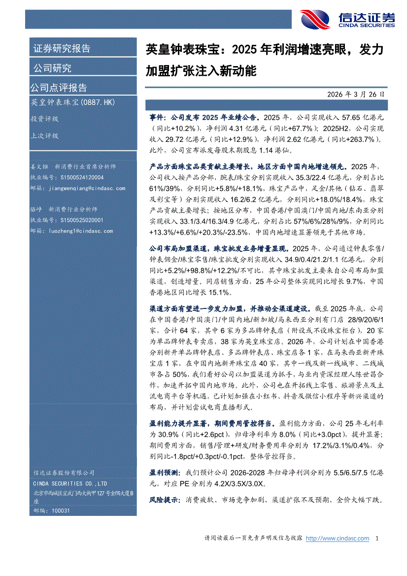 英皇钟表珠宝:信达证券-英皇钟表珠宝-0887.HK-2025年利润增速亮眼,发力加盟扩张注入新动能-260326