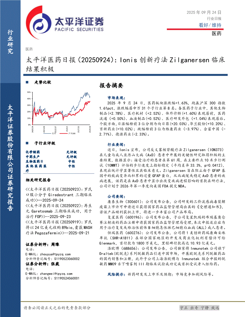 医药行业:太平洋证券-医药行业日报:Ionis创新疗法Zilganersen临床结果积极-250924