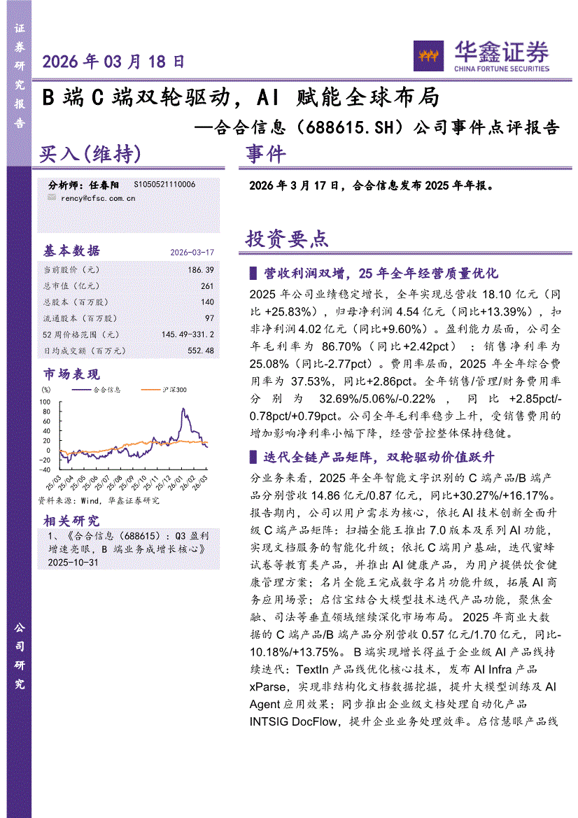 合合信息:华鑫证券-合合信息-688615-公司事件点评报告:B端C端双轮驱动,AI赋能全球布局-260318