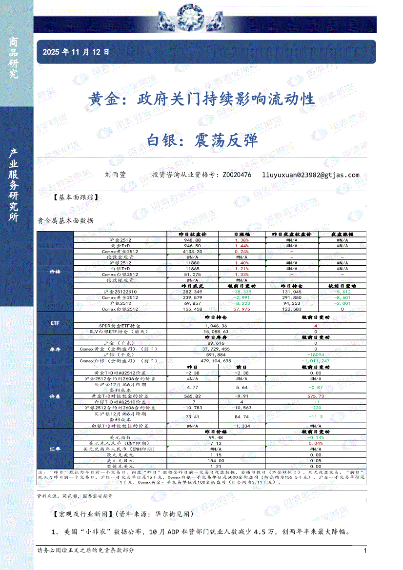 国泰君安期货-黄金:政府关门持续影响流动性,白银,震荡反弹-251112