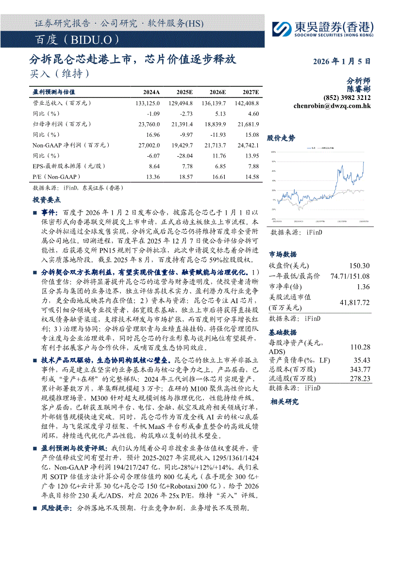 百度:东吴证券(香港)-百度-BIDU.US-分拆昆仑芯赴港上市,芯片价值逐步释放-260105