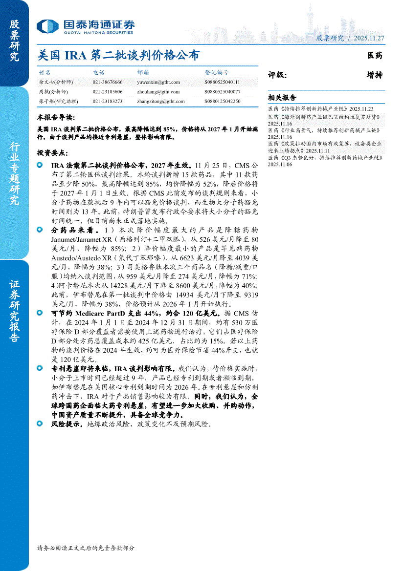 医药行业:国泰海通证券-医药行业专题研究:美国IRA第二批谈判价格公布-251127