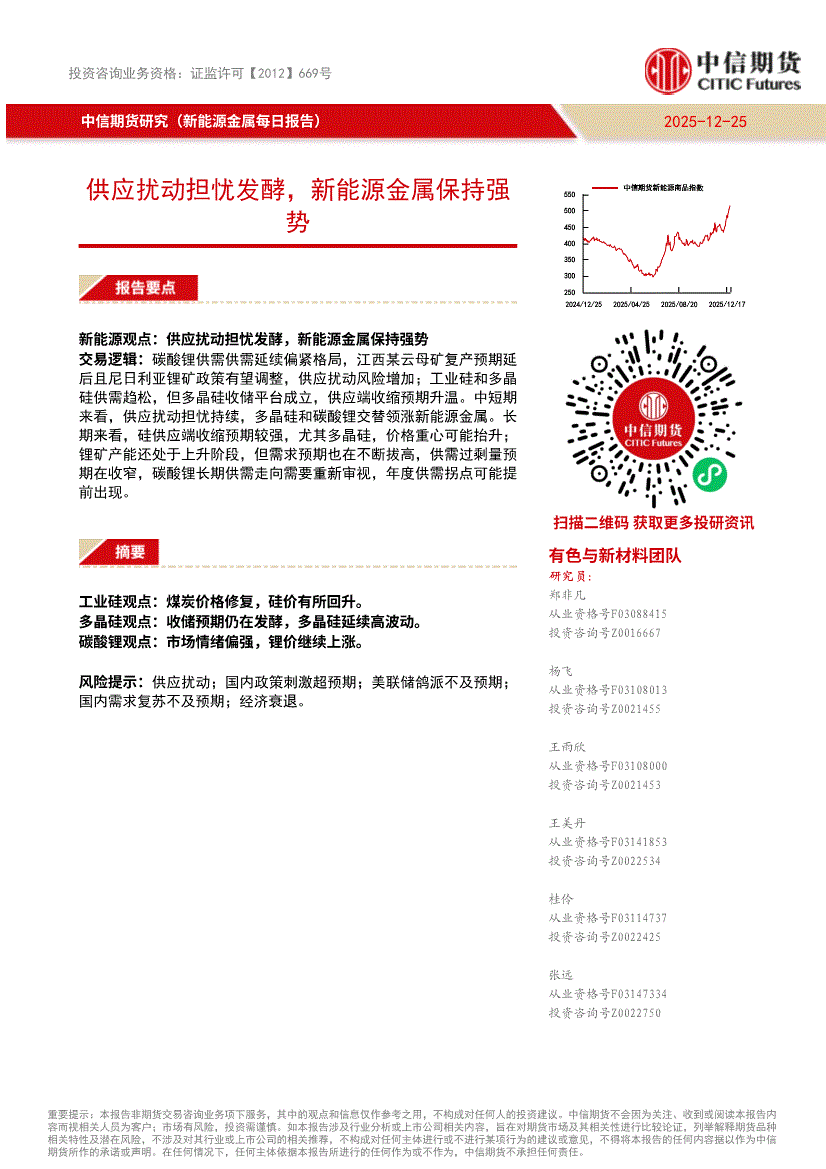 中信期货-新能源金属每日报告:供应扰动担忧发酵,新能源金属保持强势-251225