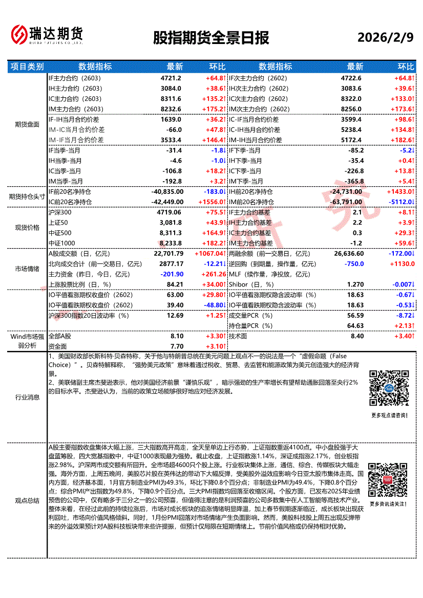 瑞达期货-股指期货全景日报-260209
