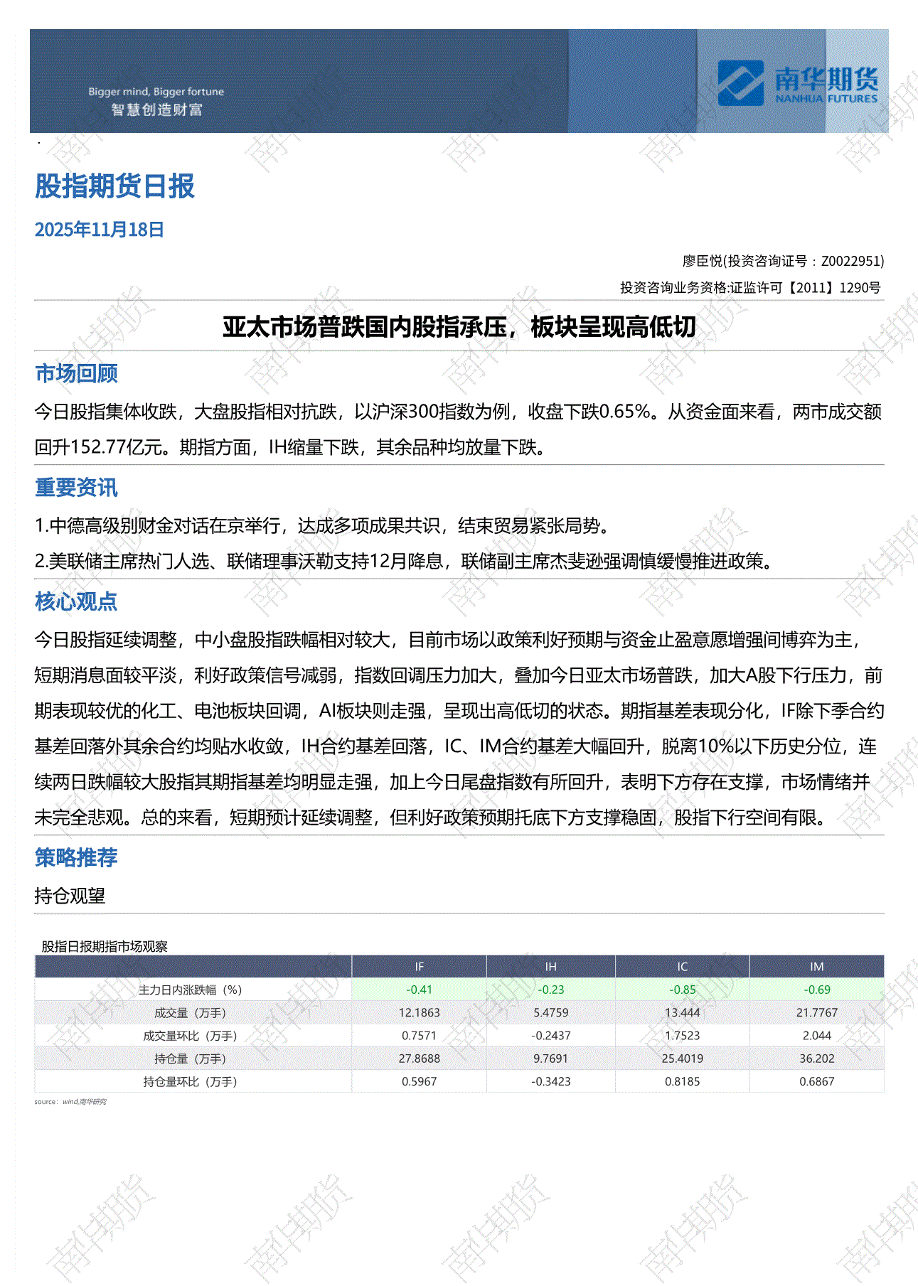 南华期货-股指期货日报:亚太市场普跌国内股指承压,板块呈现高低切-251118