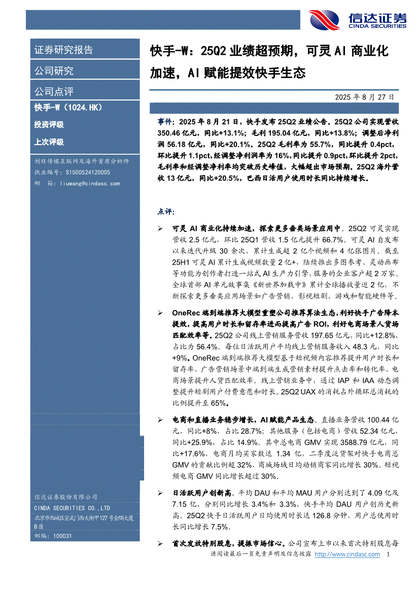 快手~W:信达证券-快手~W-1024.HK-25Q2业绩超预期,可灵AI商业化加速,AI赋能提效快手生态-250827
