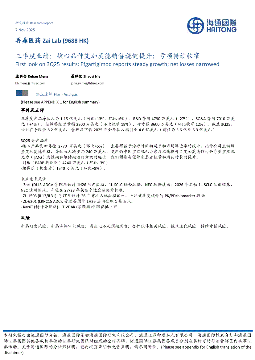 再鼎医药:海通国际-再鼎医药-9688.HK-三季度业绩:核心品种艾加莫德销售稳健提升;亏损持续收窄-251107