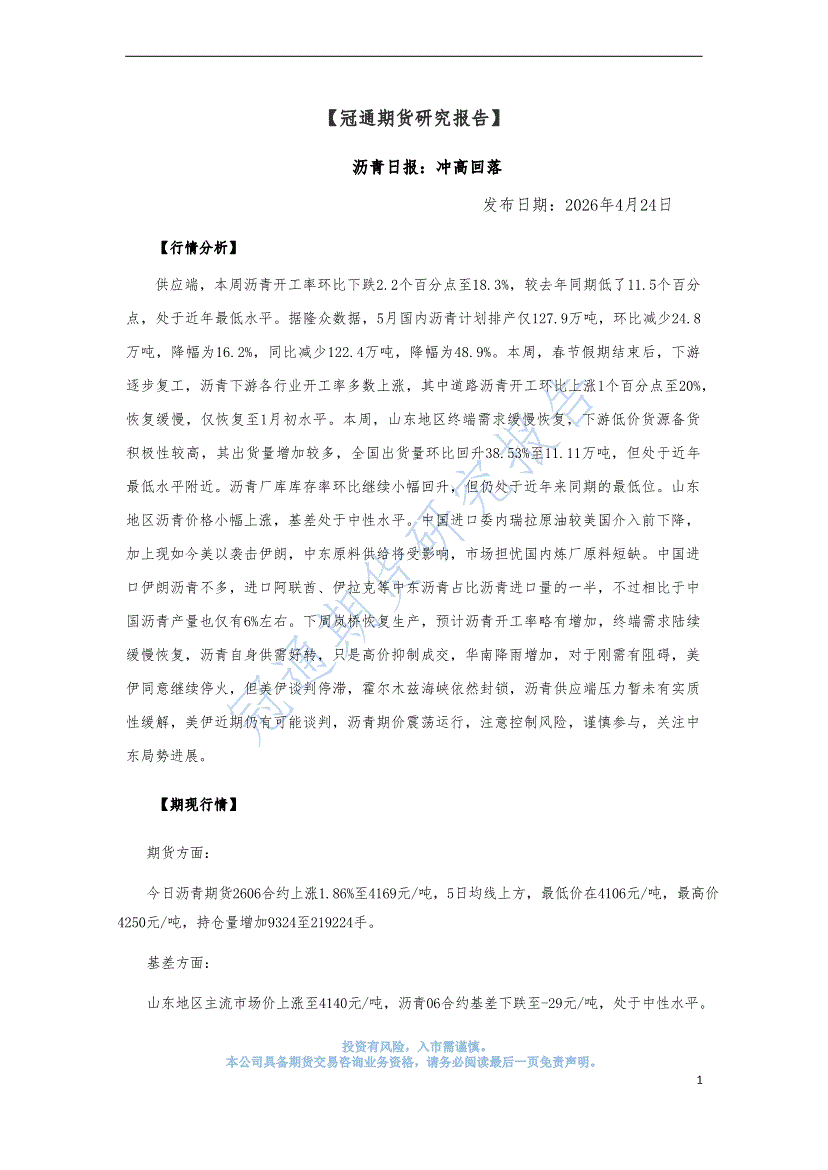 冠通期货-沥青日报:冲高回落-260424