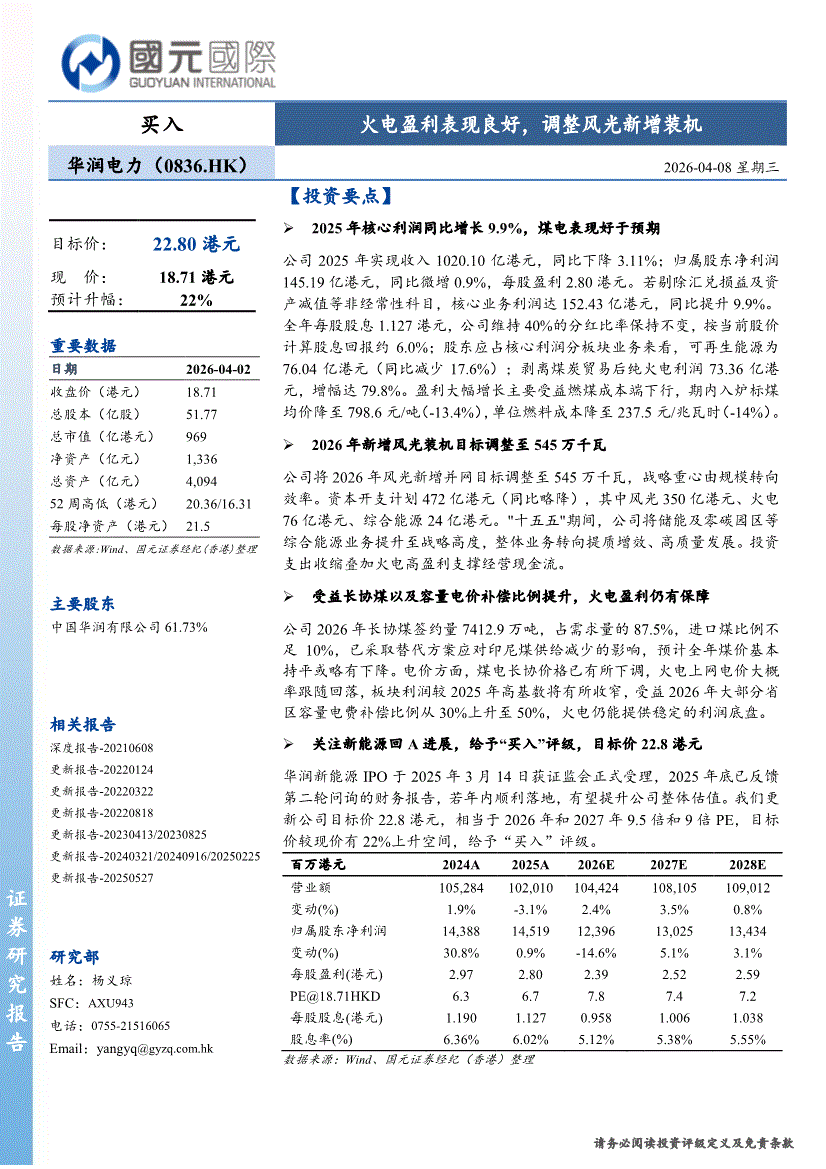 华润电力:国元国际-华润电力-0836.HK-火电盈利表现良好,调整风光新增装机-260408