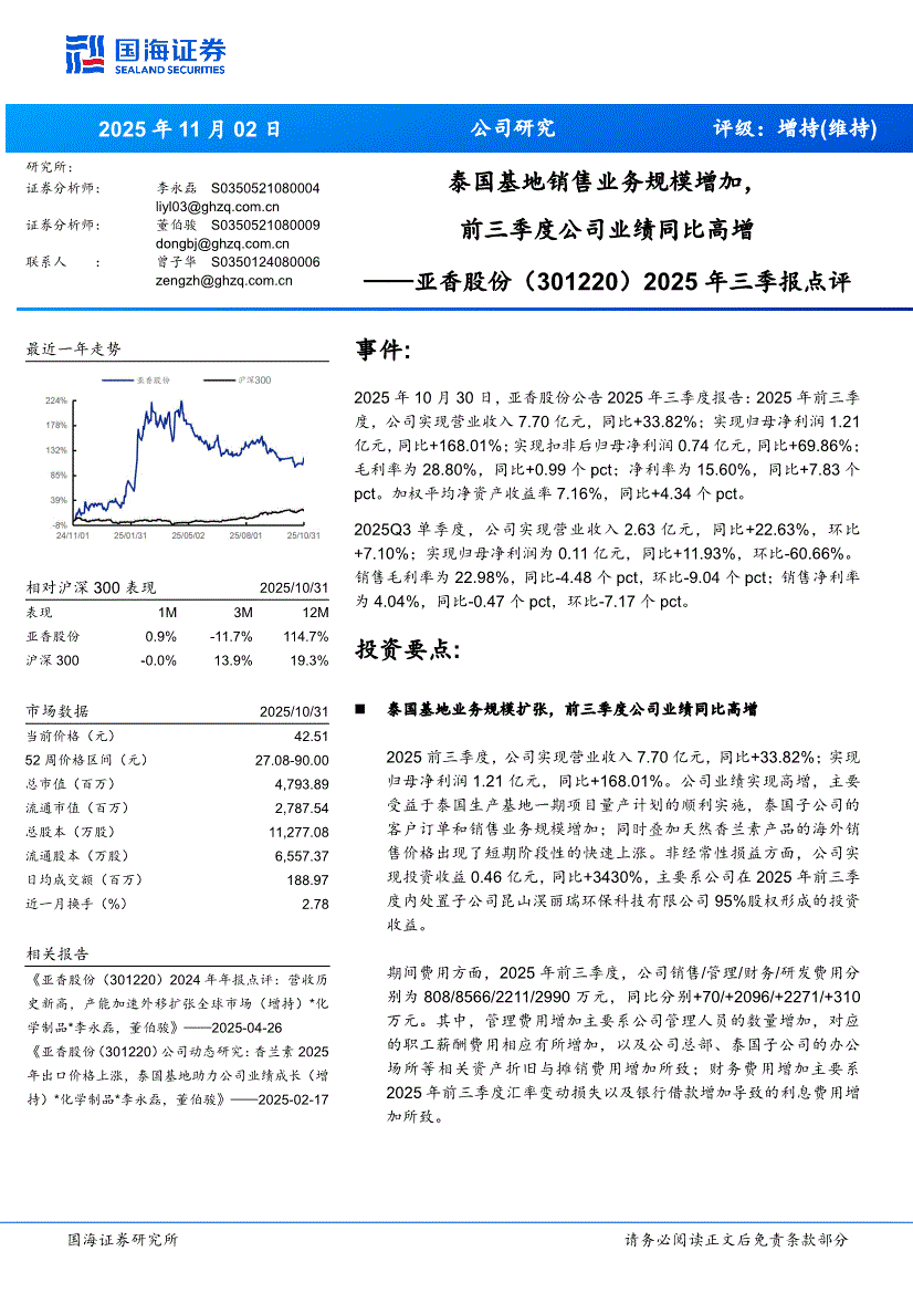亚香股份:国海证券-亚香股份-301220-2025年三季报点评:泰国基地销售业务规模增加,前三季度公司业绩同比高增-251102