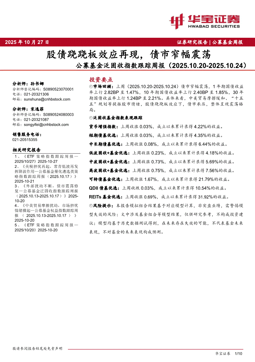 华宝证券-公募基金泛固收指数跟踪周报:股债跷跷板效应再现,债市窄幅震荡-251027