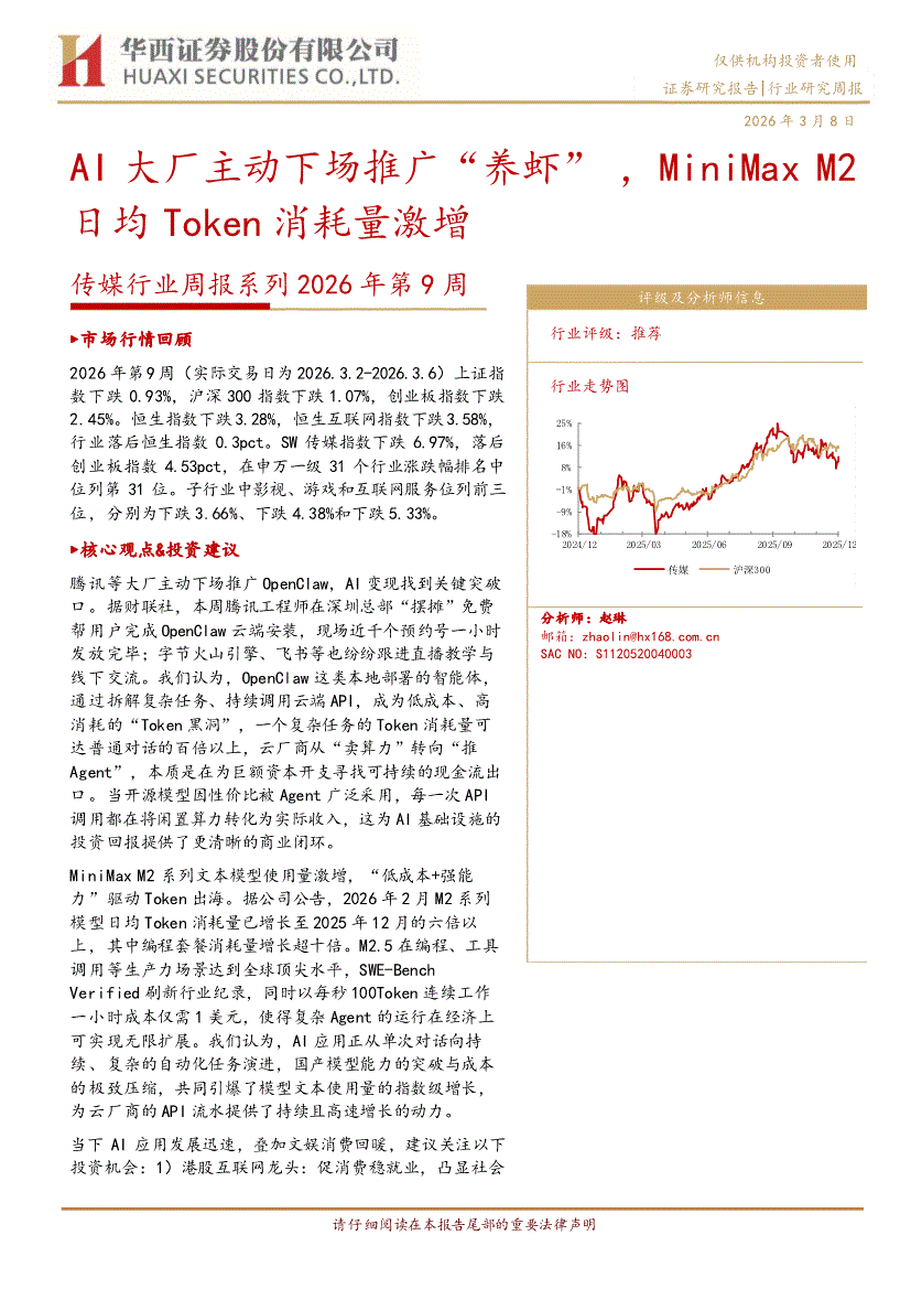 传媒行业:华西证券-传媒行业周报系列2026年第9周:AI大厂主动下场推广“养虾”,MiniMax M2日均Token消耗量激增-260308