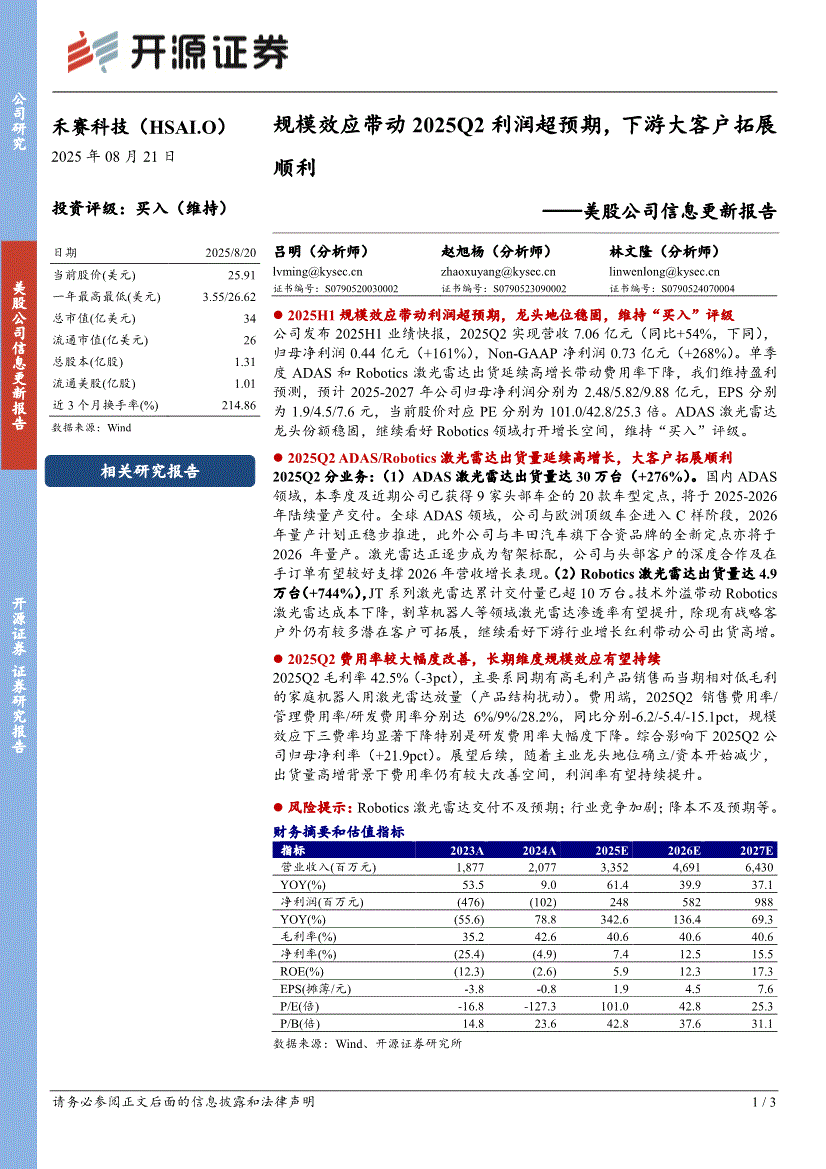 禾赛科技:开源证券-禾赛科技-HSAI.US-美股公司信息更新报告:规模效应带动2025Q2利润超预期,下游大客户拓展顺利-250821