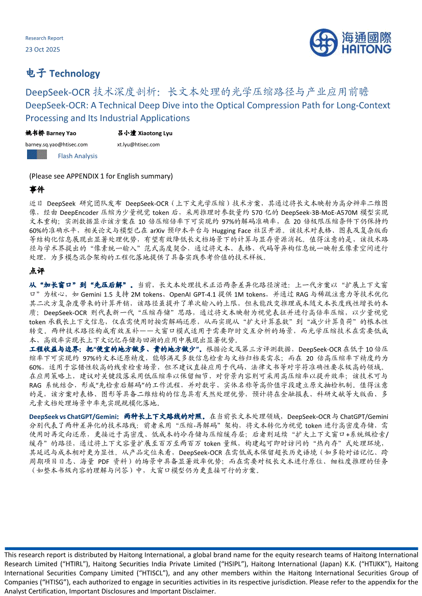 电子行业:海通国际-电子行业DeepSeek~OCR技术深度剖析:长文本处理的光学压缩路径与产业应用前瞻-251023