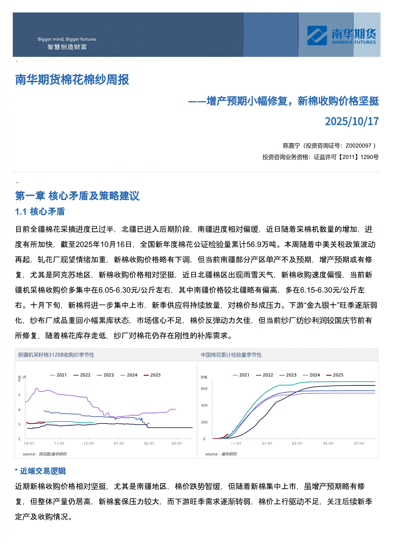 南华期货-棉花棉纱周报:增产预期小幅修复,新棉收购价格坚挺-251017