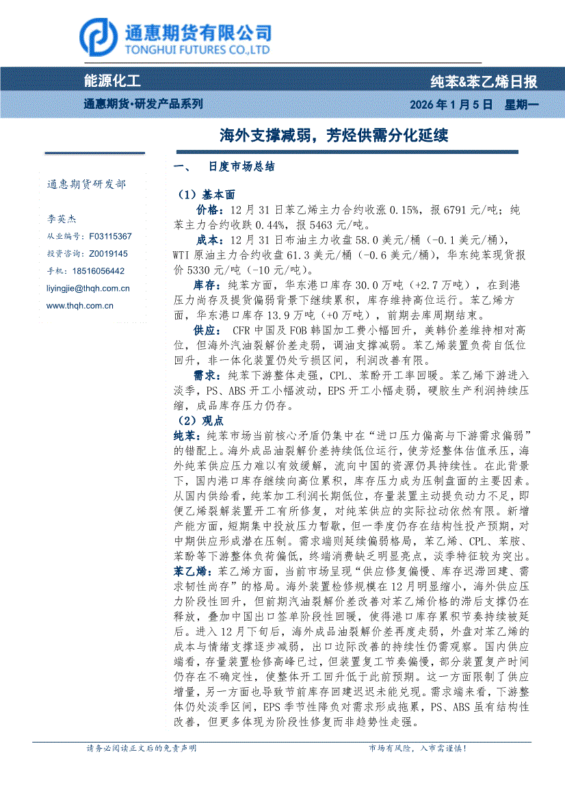 通惠期货-纯苯&苯乙烯日报:芳烃供需承压,去库节奏放缓-260106